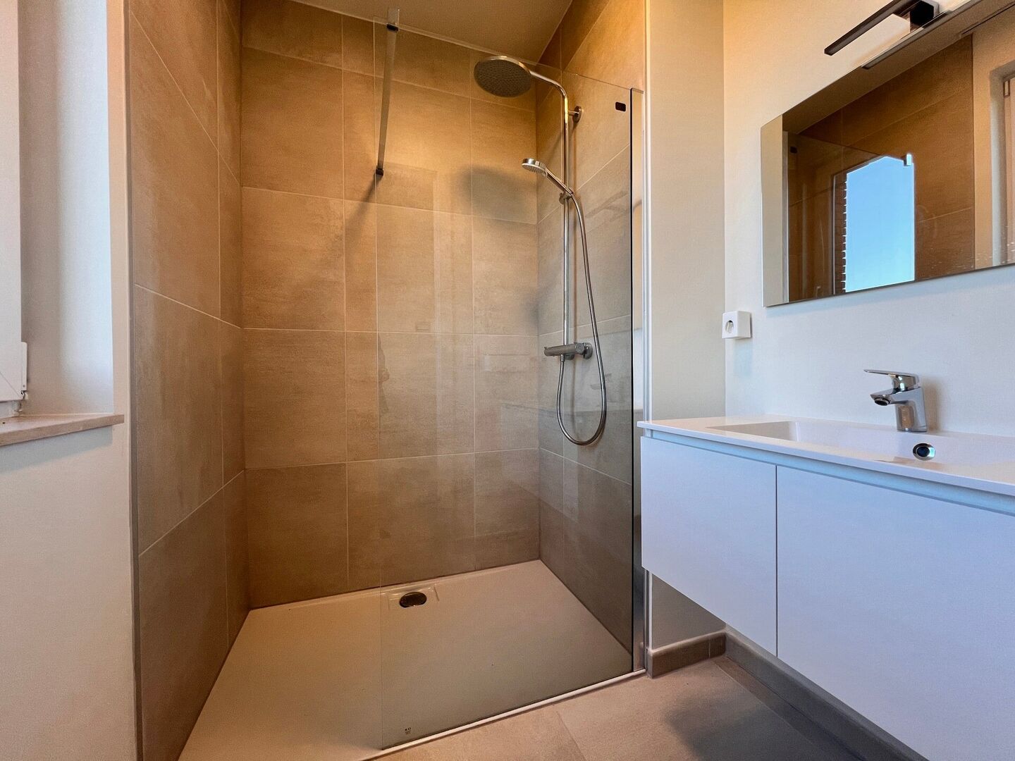 De ruime inkomhall met voldoende plaats voor een garderobekast leidt je naar de lichtrijke woonruimte met open volledig uitgeruste keuken (vitrokeramische kookplaat, dampkap, heteluchtoven, inbouwkoelkast en vaatwasser) met ruim overdekt terras. Aan de keuken grenst een aparte berging waar de aansluiting zit voor wasmachine en droogkast en met voldoende ruimte voor extra opslag. Verder vind je een ruime slaapkamer, een prachtig ingerichte badkamer met dubbele wastafel en bad en een tweede kleinere slaapkamer met eigen doucheruimte voorzien van een inloopdouche en wastafel. Het appartement is voorzien van licht armaturen en gordijnrails.