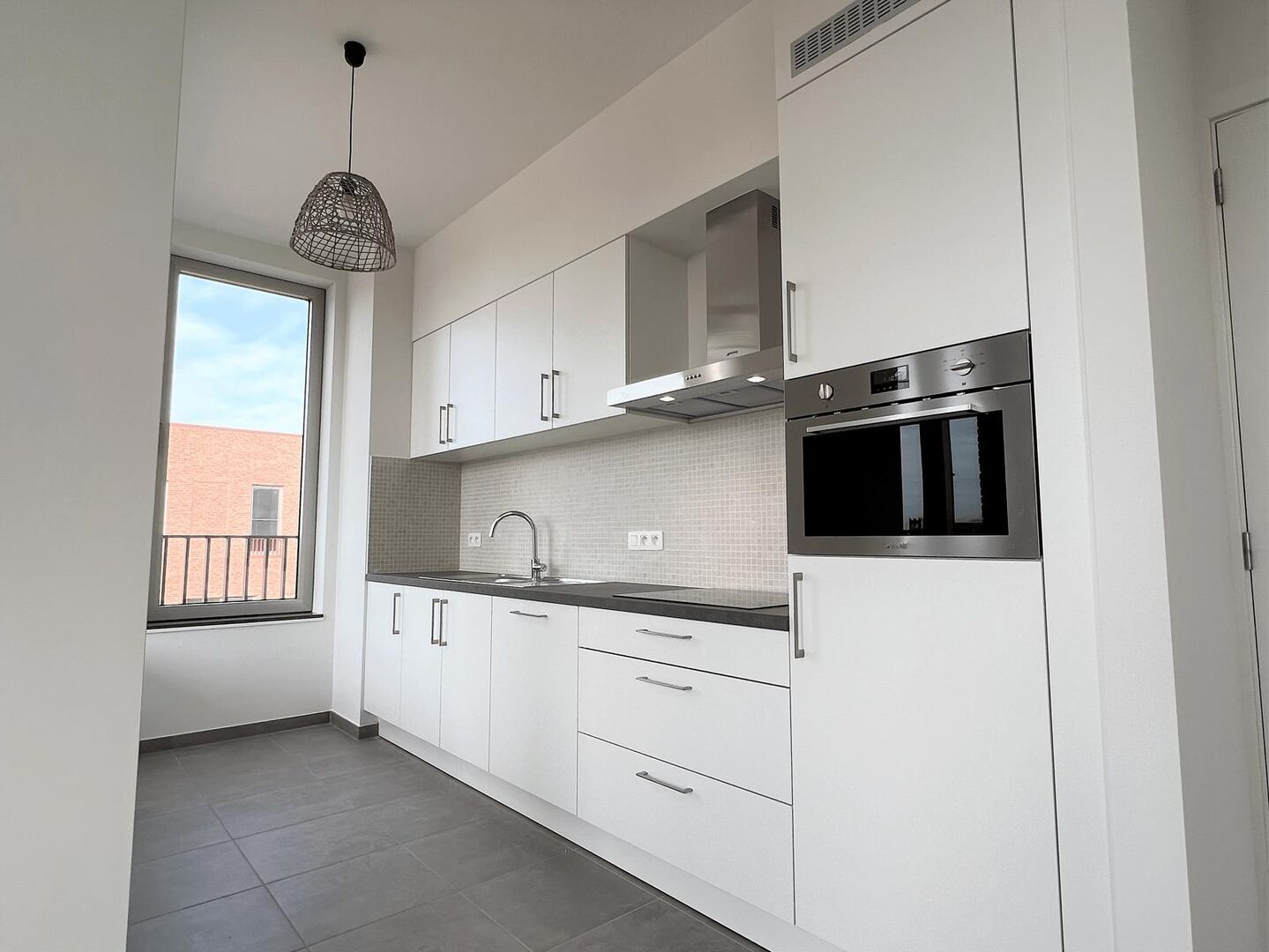 De leefruimte (keramische vloer) met open geïnstalleerde keuken (keramische vloer) biedt via het grote schuifraam toegang tot het leuke inpandig terras. De keuken is voorzien van een vitrokeramische kookplaat, een dampkap, een hete luchtoven, een inbouwkoelkast met vriesvak en een vaatwasmachine. Er is een aparte ruime berging, waar plaats is voor een wasmachine en droogkast.
