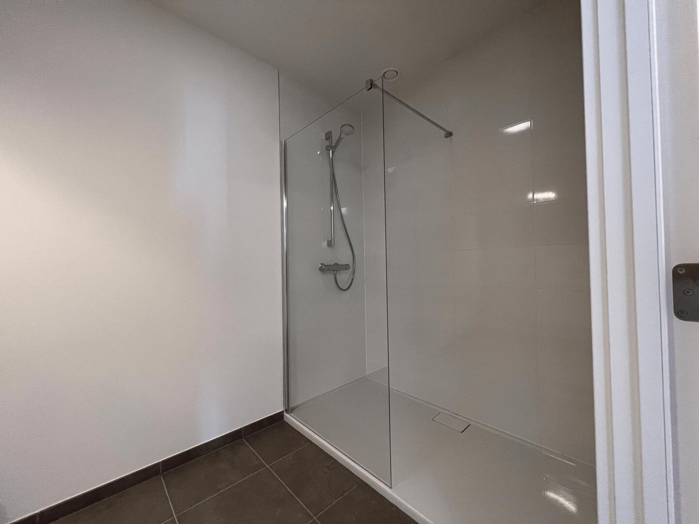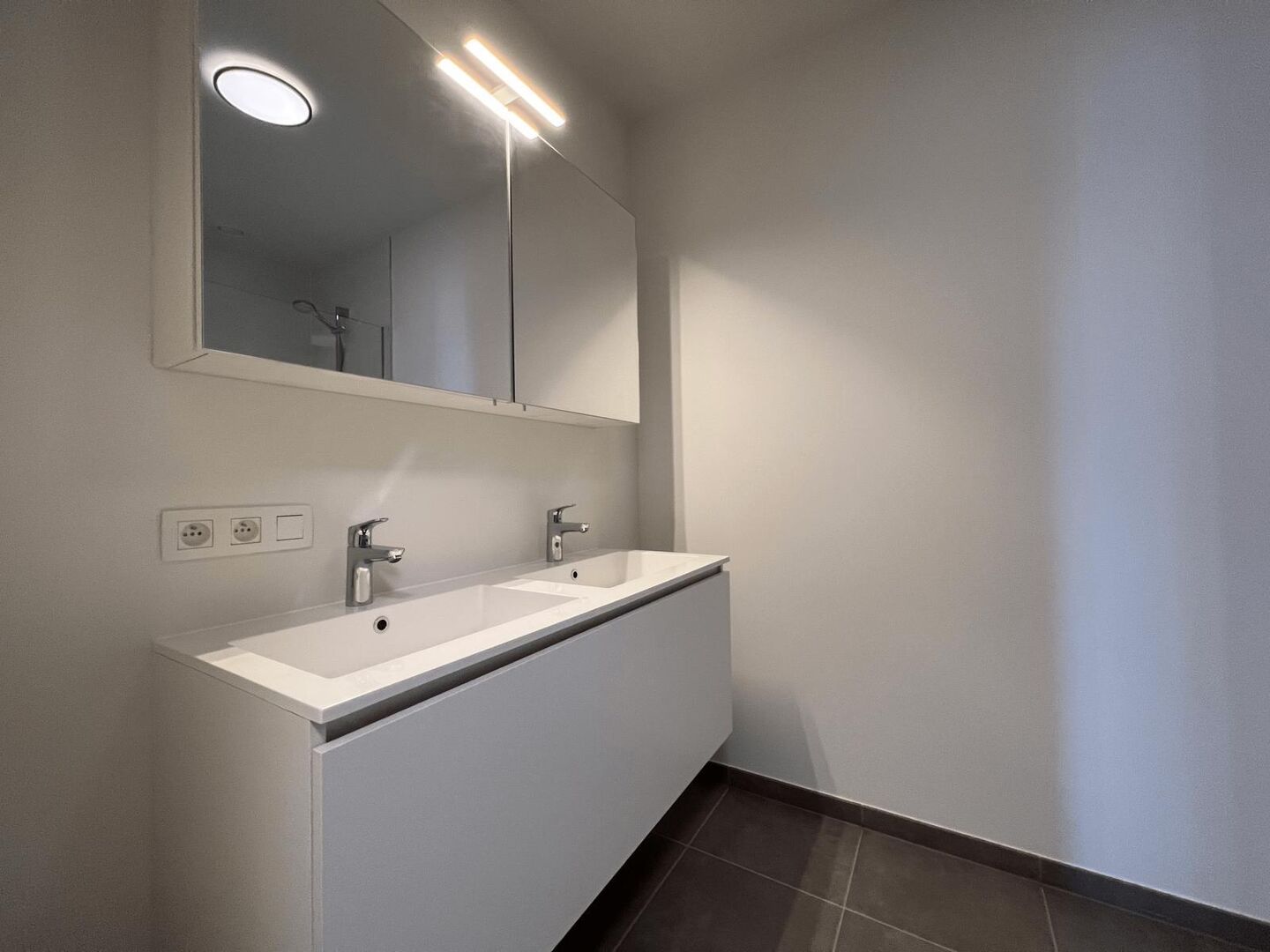 De badkamer is ingericht met een hangmeubel met dubbele wastafel met daarboven een spiegelkast, en een inloopdouche.