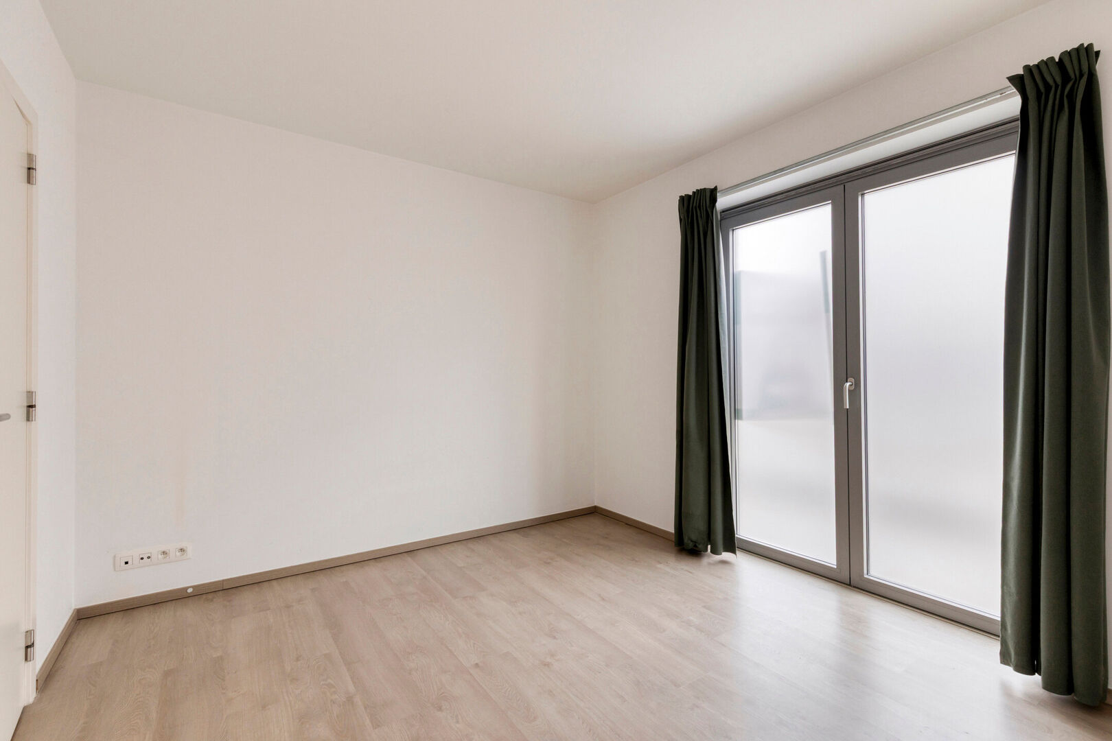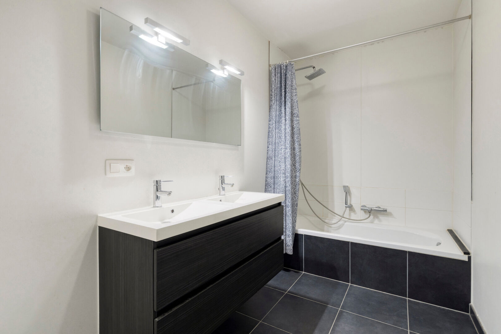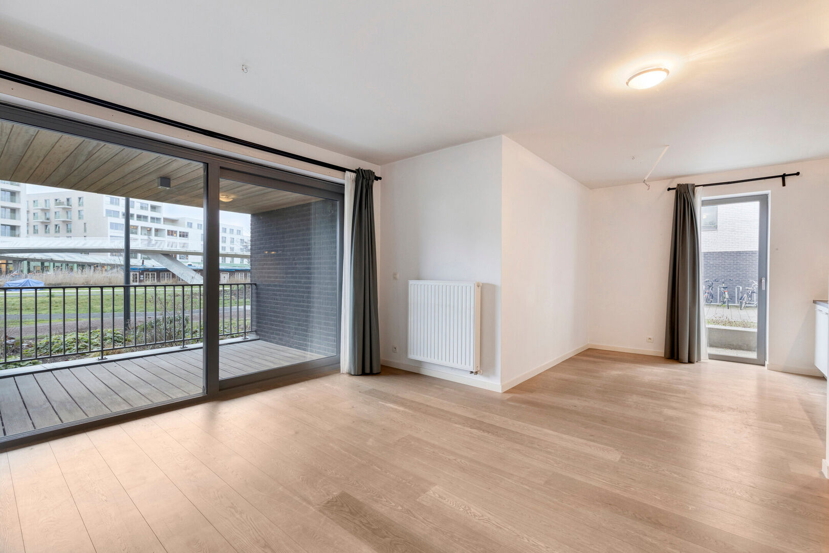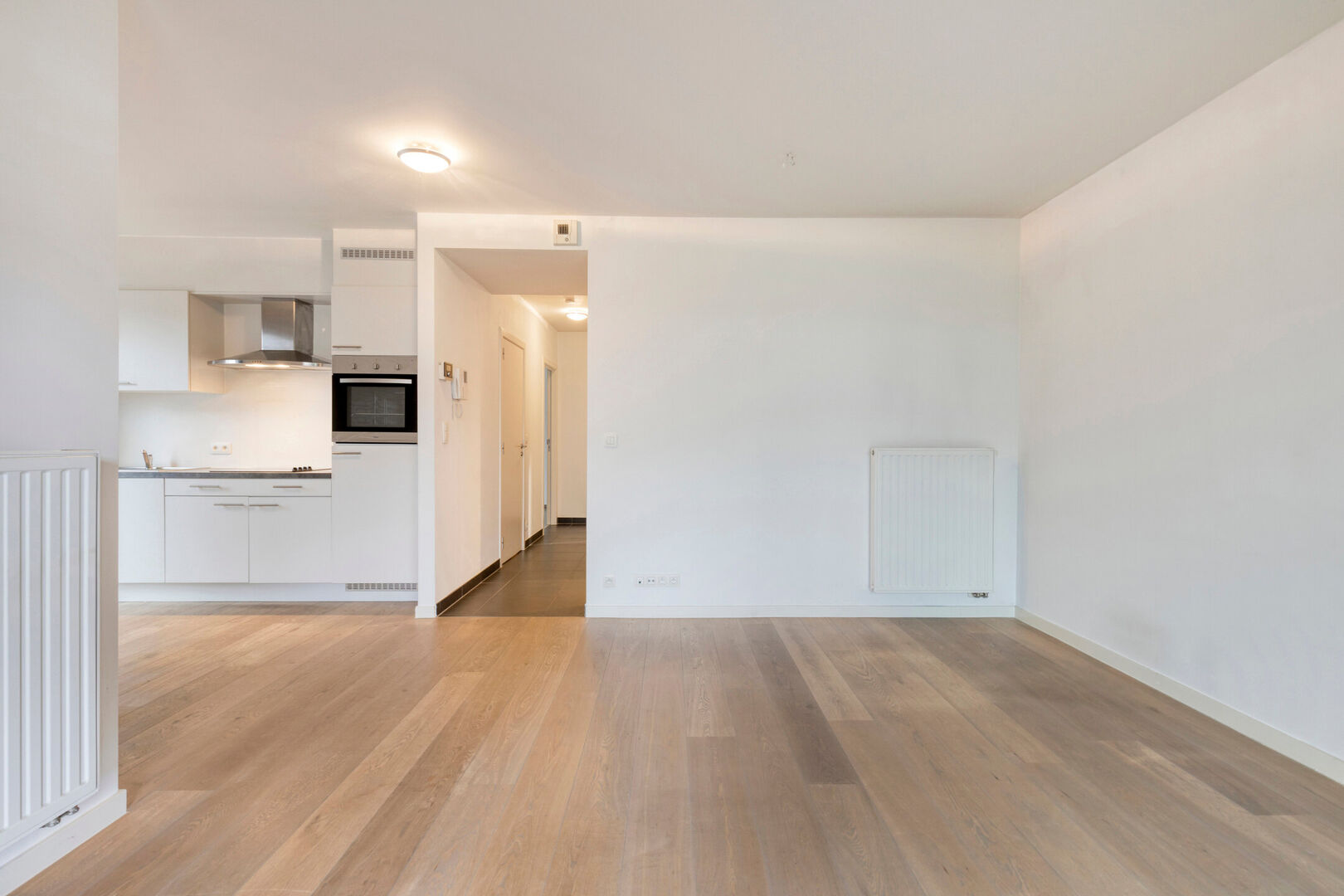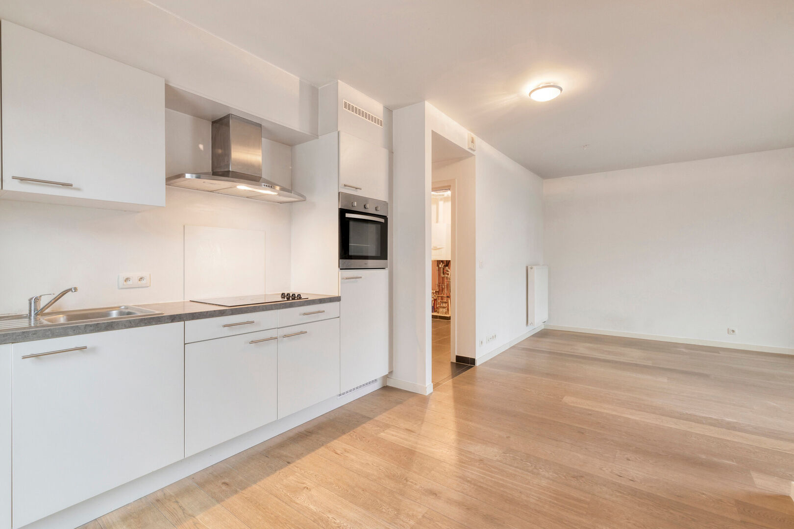 Het appartement beschikt over één volwaardige slaapkamer en een badkamer met dubbele lavabo en ligbad, dat eveneens gebruikt kan worden als douche. De lichtrijke leefruimte sluit mooi aan op de ingerichte keuken, wat zorgt voor een open en aangenaam woongevoel.