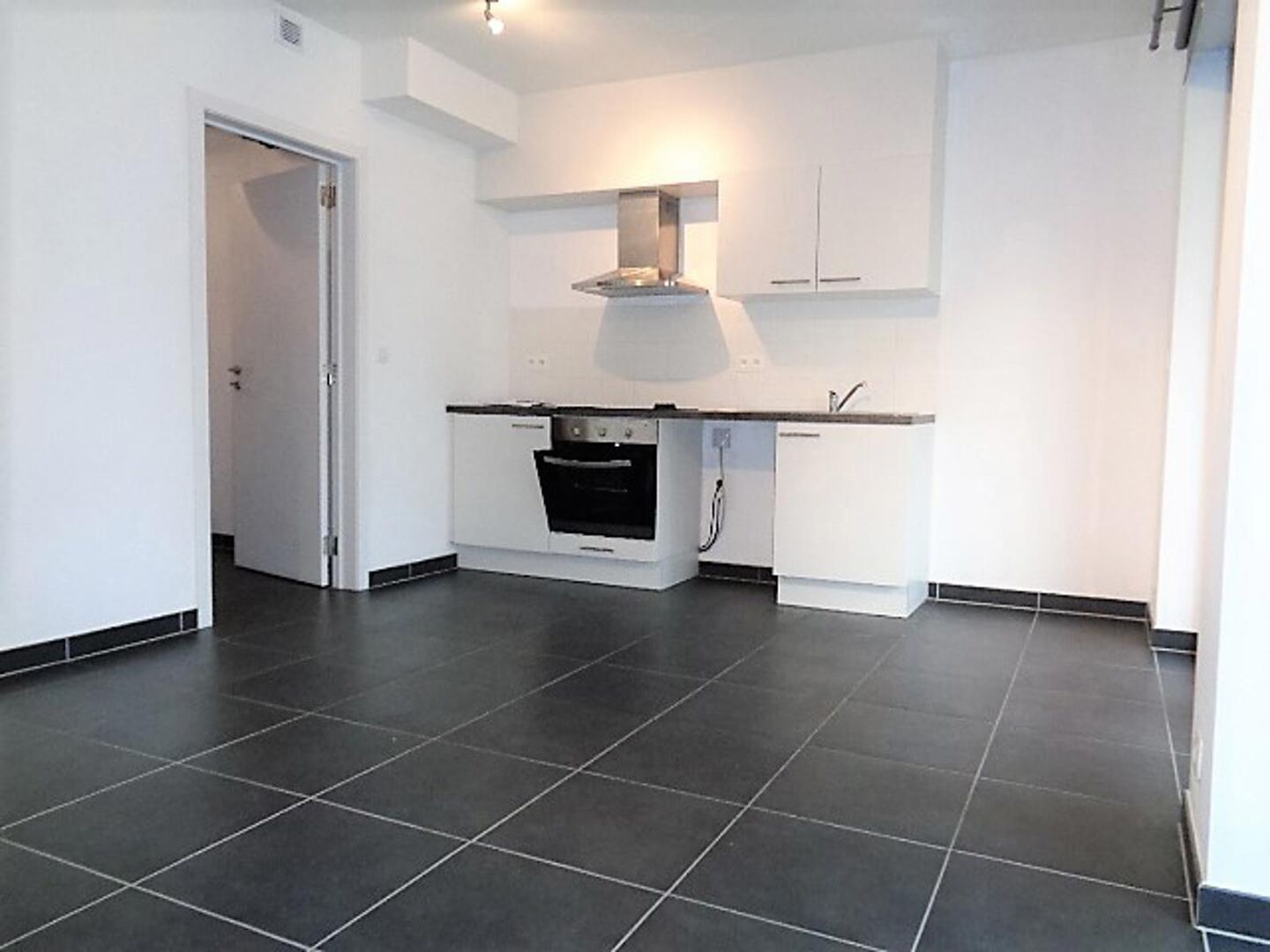 De ruimte (keramische vloer) is voorzien van een kleine geïnstalleerde keuken en biedt via het grote schuifraam toegang tot het leuke terras. De keuken is voorzien van een vitrokeramische kookplaat, een dampkap, een oven, en een inbouwkoelkast. Achter de keuken ligt de berging, waar plaats is voor een wasmachine en droogkast.