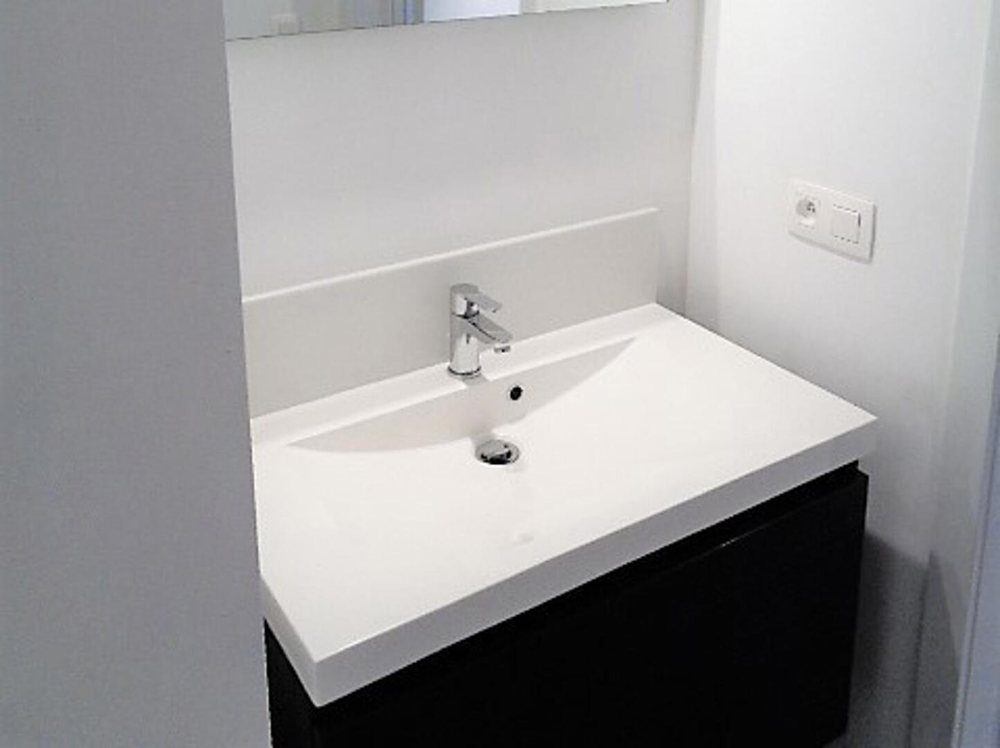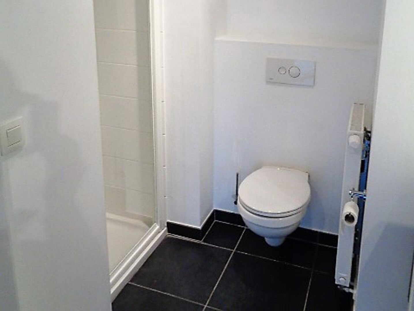 De badkamer is ingericht met een hangmeubel met wastafel en een douche en toilet.